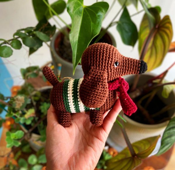 Perrito salchicha para adornar el árbol. Hechos manos con hilos de 100% Algodón. Cada uno mide xxxxxx cm de alto.