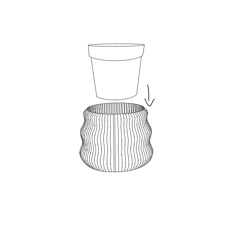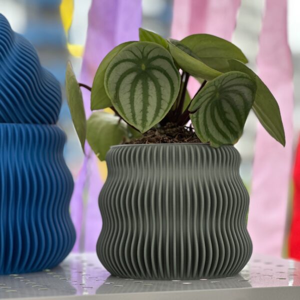 Porta Macetas impresas en 3D, fabricadas con fibras naturales como cáscara de piña, almidón de maíz, bagazo de caña y aglomerantes.