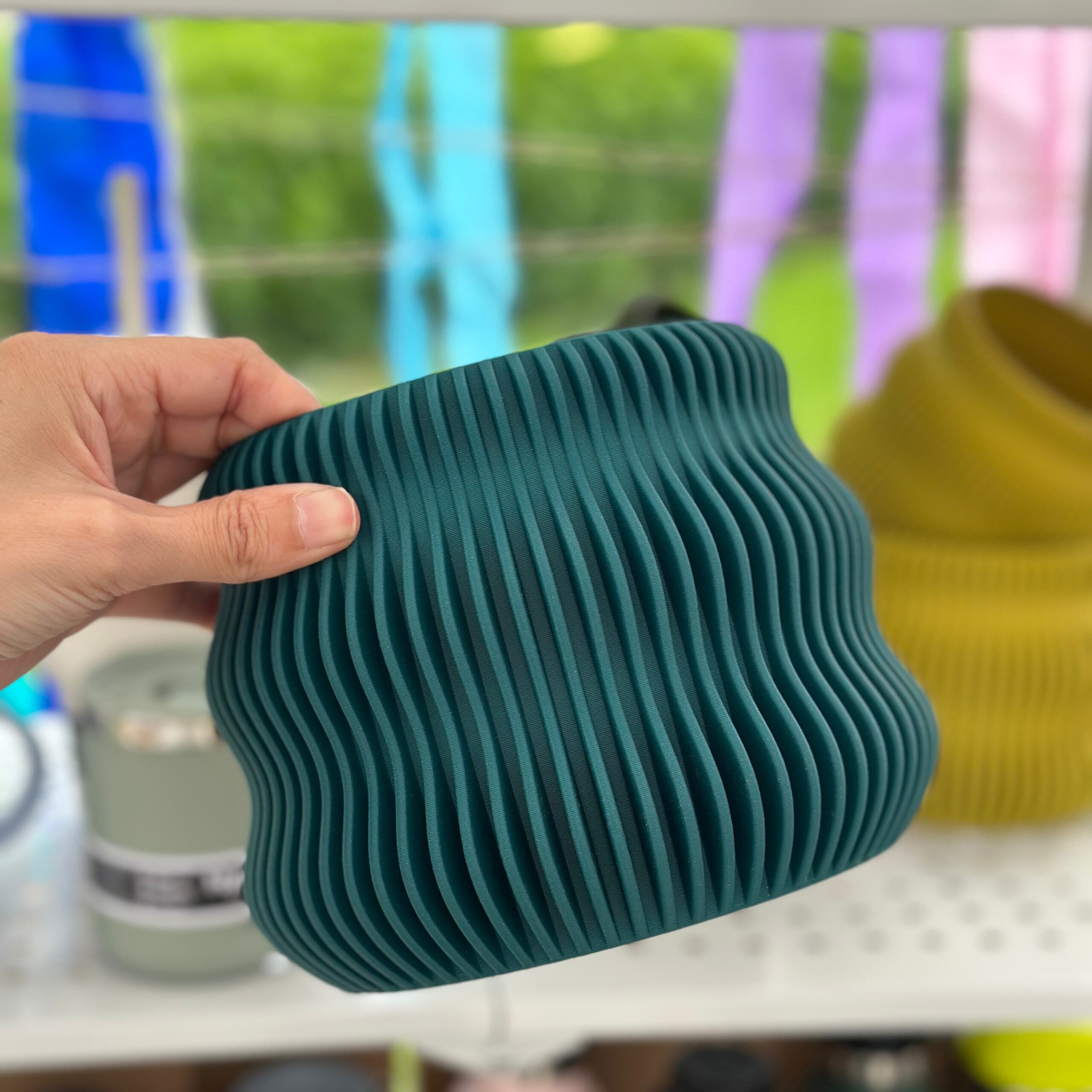 Porta Macetas impresas en 3D, fabricadas con fibras naturales como cáscara de piña, almidón de maíz, bagazo de caña y aglomerantes.